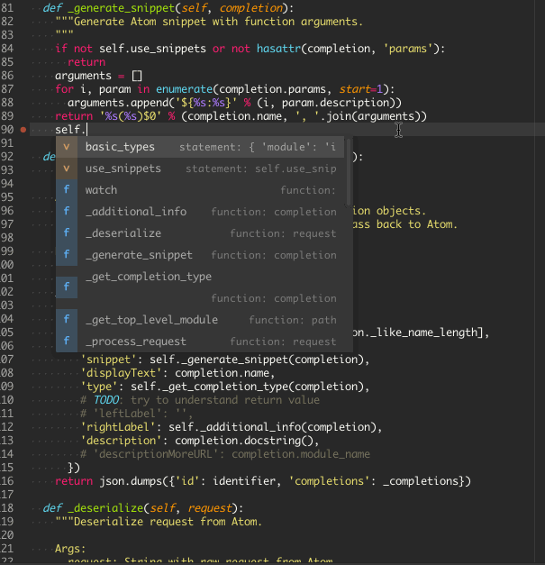 Python completions for packages, variables, methods, functions, with their arguments... I try to fix this problem. Voila its done, restart atom is not required and you will see the difference with next time you edit python code.. Voila its done, restart atom is not required and you will see the difference with next time you edit python code.